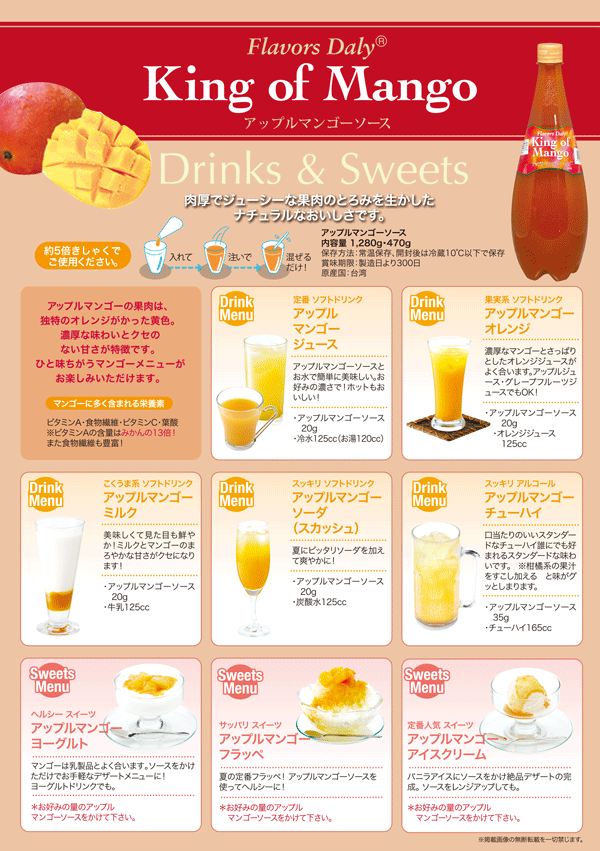 マンゴー果実本来の成分を50%以上使用しているため、濃厚でとろみのある高級感あふれる美味しさです。
